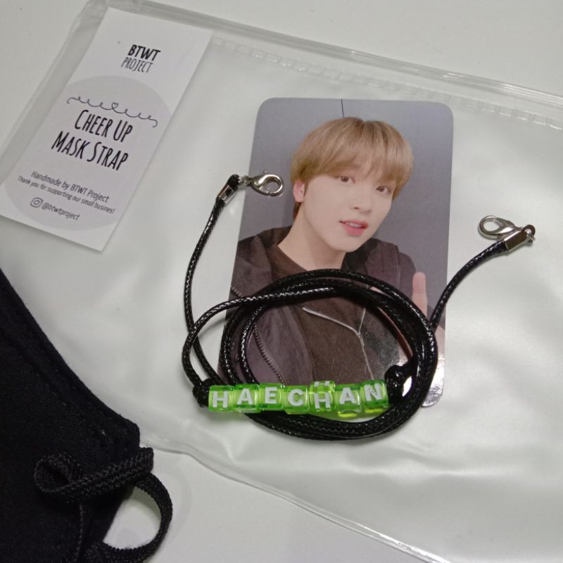 Cheer Up Strap Mask HaechanTali masker simple dengan detail nama member NCT (Sesuai stok yang tersedia di varian). Digunakan pada masker supaya masker tidak gampang hilang dan bisa tetap berada di leher.Ukuran tali +/- 50 cm.Untuk saat ini yang ready stock sesuai dengan varian yang tersedia. Member NCT lainnya bisa cek di etalase toko atau chat kami. Harga sudah termasuk zipped pouch dan masker gratis