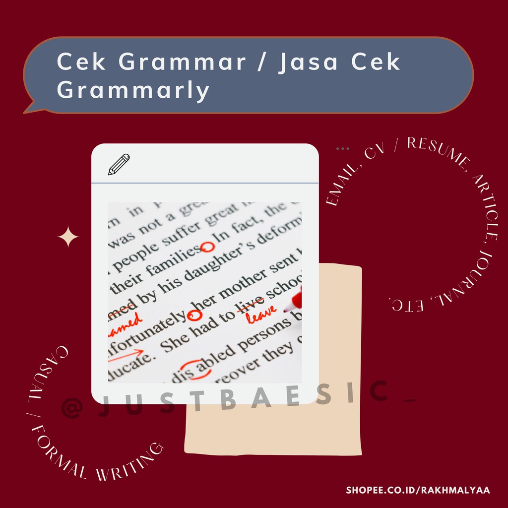 Jasa cek grammar / kosa kata bahasa Inggris untuk tugas, paper, artikel, jurnal, dll.Cek grammar manual + melalui grammarly. TIDAK MENJUAL akun grammarly ya.Harga yang tertera adalah harga per lembar (max.400 kata).Format wajib DOC atau DOCX atau Google Docs.Bisa untuk penulisan formal atau casual.BUKAN PENERJEMAH TERSUMPAH tapi TERPERCAYA, hasil kerja sendiri, bisa dilihat foto sertifikat asli kemampuan bahasa Inggris admin @justbaesic_TIDAK MENERIMA CUSTOMER TIDAK SABARAN. Penerjemah hanya seorang, pengerjaan dilakukan dari orderan yang lebih dahulu masuk ke akun shopee.---------------Estimasi waktu pengerjaan (bisa lebih cepat)1-2 lembar (max.800 kata): 1 hari3-4 lembar (max. 1600 kata): 2 hari5-9 lembar (max.3600 kata): 3-4 hari10-14 lembar (max.5600 kata): 5-7 hari15-20 lembar: 10-14 hari>20 lembar: akan didiskusikan lebih la