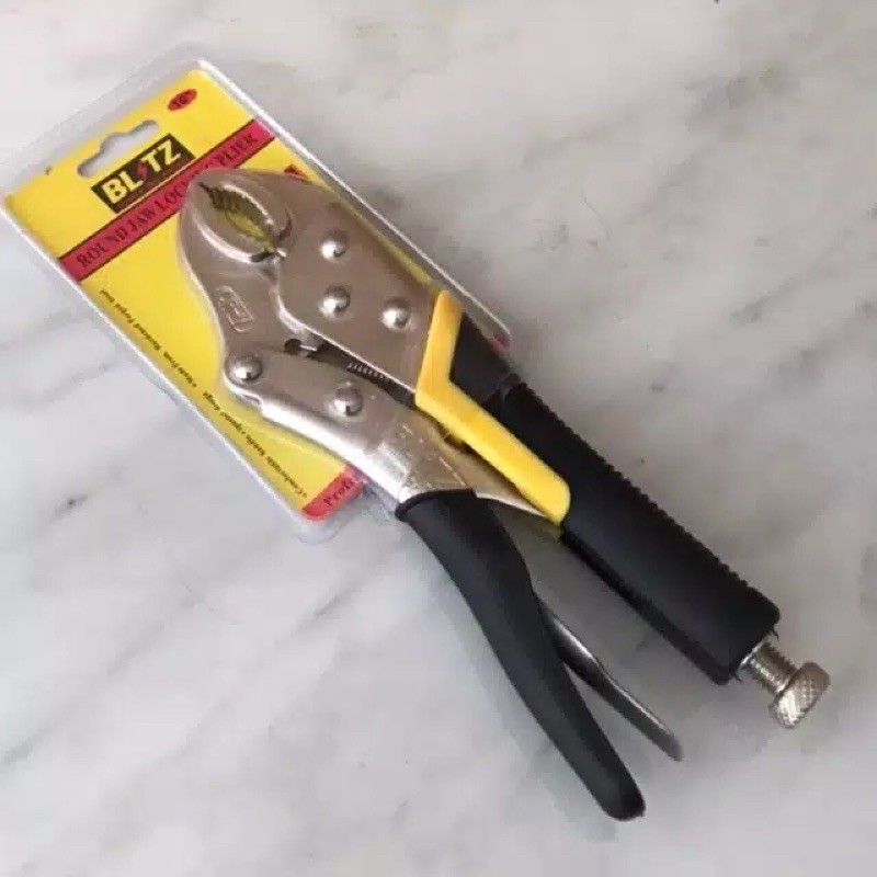 Tang Buaya BLITZ Bengkok 10 inci / Tang Jepit Curved Lock Grip Pliers / Vice Grip / Vise Grips / Mole Wrench 10 inch1bj Tang buaya, tang ini digunakan untuk menjepit barang, misalnya besi yang akan dipanaskan. Merk BLITZTipe gigi : Bengkok. Cocok untuk menjepit pipa.Gigi terbuat dari besi Drop Forged, kuat dan tahan lama.Bodi terbuat dari plat besi yang sudah di hardened dan finishing nickel-plated supaya lebih tahan terhadap korosi.Gagang polos dengan karet sehingga nyaman saat digenggam.Panjang 10 inci = 25 cm.Lebih berat pada tang buaya umumnya sehingga sudah pasti kualitas lbh bagus d banding tang buaya merk lain.Jarak menjepit diatur dengan memutar skrup yang terletak di bagian belakang dari gagang.Untuk melepas cukup dengan menarik tuas di bagian gagang tang langsung akan ter