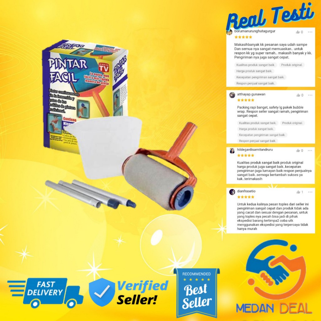 Dengan kuas roll ini, mengecat rumah menjadi sangatlah mudah.Gagang yang panjang memudahkan Anda untuk mencapai daerah yang sulit.Sistem pengisian cat yang unik mempermudah penggunannya untuk hasil cat yang rapih dan tidak berantakan.Pintar Facil Paint Roller Dengan kuas roll ini, mengecat rumah menjadi sangatlah mudah.Gagang yang panjang memudahkan Anda untuk mencapai daerah yang sulit.Sistem pengisian cat yang unik mempermudah penggunannya untuk hasil cat yang rapih dan tidak berantakan.Supaya bisa menjangkau daerah yang tinggi, kuas roll ini dilengkapi tiga gagang aluminium yang bisa disambungkan hingga setinggi 70cm.Penggunaan gagang yang bisa dilepas dan diatur ketinggiannya sesuai keperluan.Berbeda dengan kuas roll biasa, kuas ini mengharuskan Anda untuk mengisi cat ke dalam tabung didalamnya suapaya bisa digunakan untuk mengecat.Dengan fitur ini hasil cat Anda akan menjadi lebih rapih dan tidak berantakkan.Barang-barang yang anda dapat dalam kotak produk:1 x Kuas Roll ( Lebar +- 16cm )3 x Gagang Extender1 x Gelas Penuan