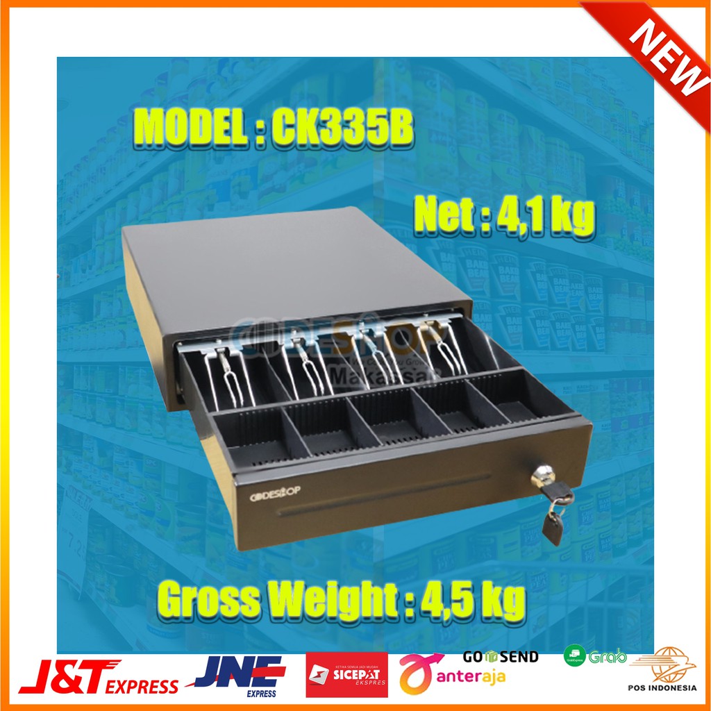 LACI UANG CASHDRAWER MODEL CK335B CODESHOP Cocok untuk usaha - Coffe Shop - Retail Restoran - Parkir - Tiket - Departement Store - Ekspedisi dll Application : POS Machine / ECRBill / Coin : 4Bill/ 5CoinMaterial : SPCC cold rolling plate housing, SECC electroplating zinc bottom plateInterface : RJ11Berikut ada 5 kelebihan pada laci kasir CODESHOP CK335B- Metal cash drawer with heavy-duty ball bearing rollers- Dibuat dari bahan metal berkulitas tinggi dengan bahan pelapis anti karat- Media penyimpanan koin & kertas (4 Slot Uang Kertas & 5 Slot Uang Coin)- Dimensi Ukuran ( W x D x H ) : 330mm x 360mm x 82mm- Posisi Kunci pengaman otomatis & interface RJ11- Durabilitas t