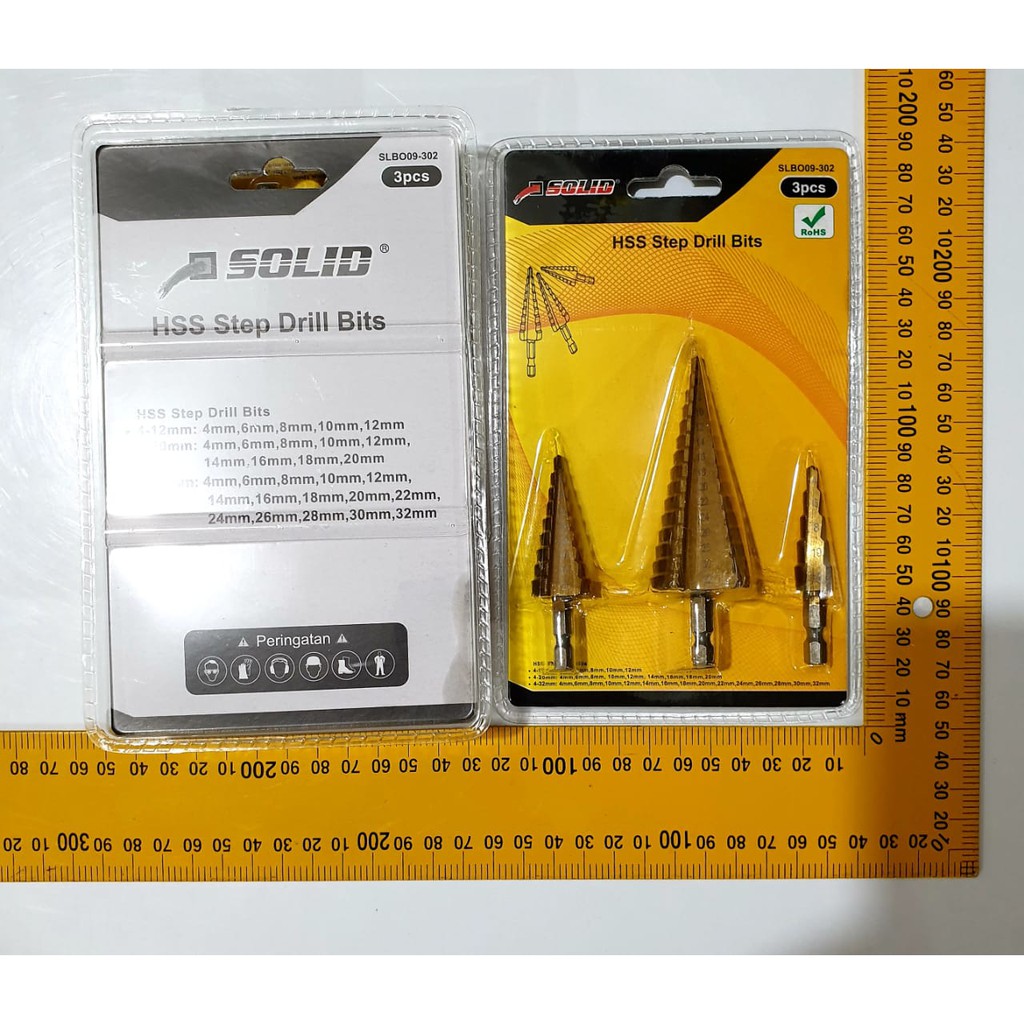 Deskripsi Mata Bor SET 3pc 32mm mata bor Pagoda Multi Step Cone DrillPaket 3 pcs mata bor + mini tas.**Spesifikasi:Material: High-Speed SteelSurface Treatment: Titanium coatedShank Diameter: 6.35mmDimensi Length:- 4-12mm Length: Approx. 6.7cm/ 2.64"- 4-20mm Length: Approx. 7.4cm/ 2.91"- 4-32mm Length: Approx. 10.2cm/ 4.02"The 3 Cutters Come in the Following Sizes:- 4-32mm (4mm, 6mm, 8mm, 10mm, 12mm, 14mm, 16mm, 18mm, 20mm, 22mm, 24mm, 26mm, 28mm, 30mm, 2mm)- 4-20mm : 4mm, 6mm, 8mm, 10mm, 12mm, 14mm, 16mm, 18mm, 20mm, 14mm, 16mm, 18mm, 20mm- 4-12mm (4mm, 6mm, 8mm, 10mm, 2mm)Cannot be used for stainless steelWhen inject cold water while working, can effectively extend the service life of the dril