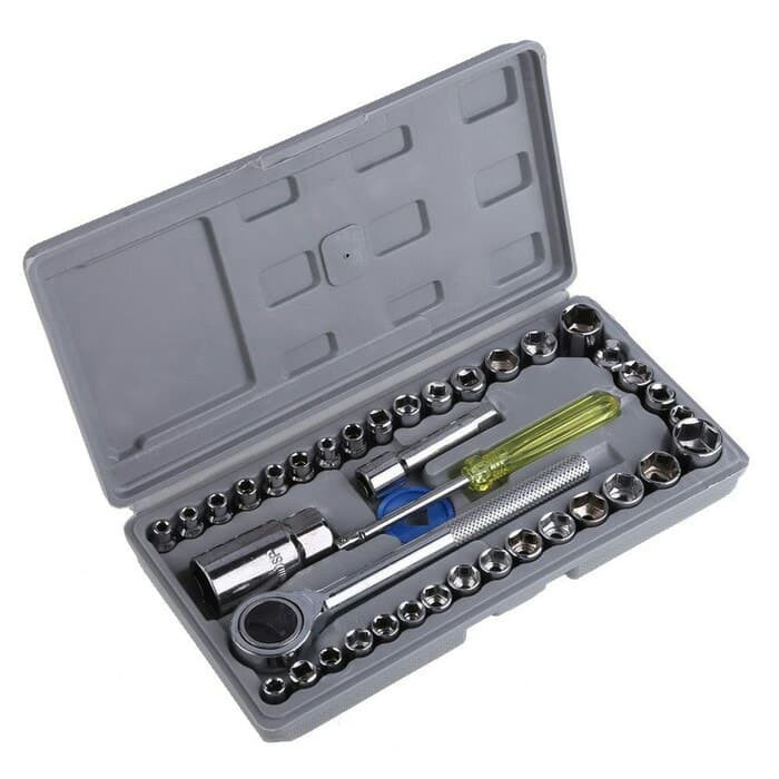 Deskripsi Kunci Socket Sok Shock Tool Kit Wrench Ring 40 Pcs Set 40PcsKunci Sock Socket ini Merupakan sebuah kunci sock dengan 40 jenis ukuran dan jenis kepala yang dirancang khusus untuk memudahkan Anda menemukan perkakas tanpa repot. Produk istimewah dengan kualitas prima. Mudah digunakan untuk otomotif, praktis dan mudah dibawa kemana saja. Dengan set kunci sock ini, Anda dapat memiliki semua jenis kunci yang Anda butuhkan dalam pekerjaan Anda. Dilengkapi juga dengan beberapa jenis pegangan sehingga Anda dapat memilih sesuai kebutuhan Anda.Spesifikasi:1 buah 3/8 REVERSIBLE RATCHET HANDLE14 buah DR.METRIC SOCKETS ukuran 4mm, 4.5mm, 5mm, 5.5mm, 6mm, 6.5mm, 7mm, 7.5mm, 8mm, 9mm, 10mm, 11mm, 12mm, 13mm14 buah DR. SAE SOCKETS ukuran 5/32mm, 3/16mm, 7/32mm, 1/4mm, 9/32mm, 5/16mm, 11/32mm, 3/8mm, 13/32mm, 7/16mm, 15/32mm,1/2mm, 7/32mm, 9/163 buah DR. SAE SOCKET(8PT.): 1/4,5/16,3/81 buah 3/8DR.x3EXT BAR1 buah *3/8 ADAPTOR1 buah 3/8 DR.x21mm SPARK PLUG SOCKET1 buah 6 SPINNER HANDLE2 buah 3/8 DR. METRIC SOCKET ukuran 15mm,